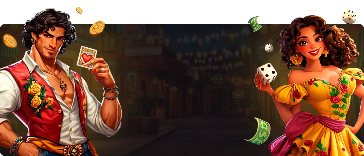 We use a dark background with bright orange and purple accents, so banners and game tiles stand out clearly. The theme mixes fiesta elements, cartoon characters and colourful symbols. You see mariachis, chilli peppers and other playful icons on cards and bonuses, which keeps the lobby lively without making it hard to read.